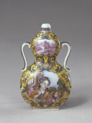 此瓶纹样描绘细腻,尤其是开光内的西洋女子衣着华丽,因采用了西洋画的明暗透视技法而具有立体效果。葫芦形的瓶体和山水图案则体现了中国传统的文化意味。东西文化的交融在这件器物上达到了和谐的统一。
