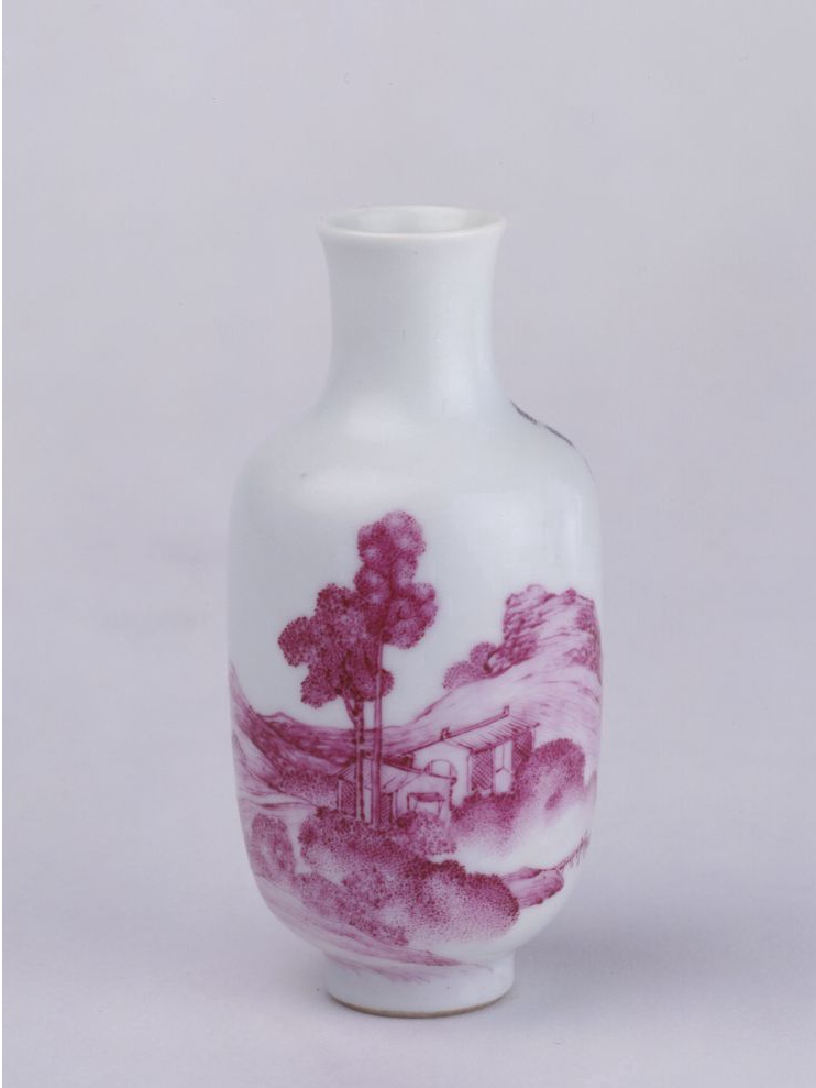 胭脂红彩山水纹小瓶,清乾隆,高9.6厘米,口径2.2厘米,足径2.2厘米。