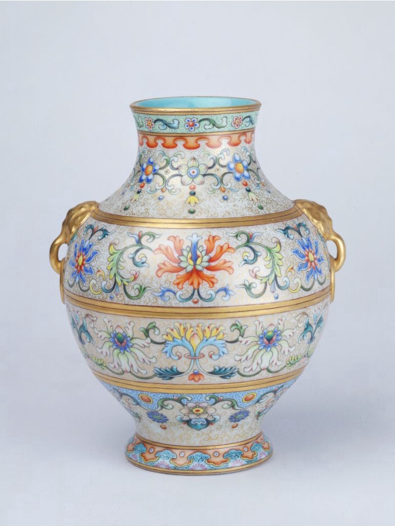 瓶撇口,短颈,圆腹,圈足。内施松石绿釉。外壁以金彩绘7道弦纹,肩部两侧对称置鎏金象耳衔环铺首。主题纹饰为金彩锦纹地上绘宝相花纹。圈足内施松石绿釉,署青花篆书“乾隆年制”双行四字款,外围青花双方栏。