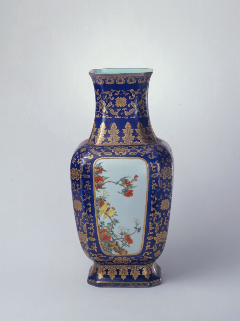 霁蓝釉描金地开光粉彩花鸟纹方瓶