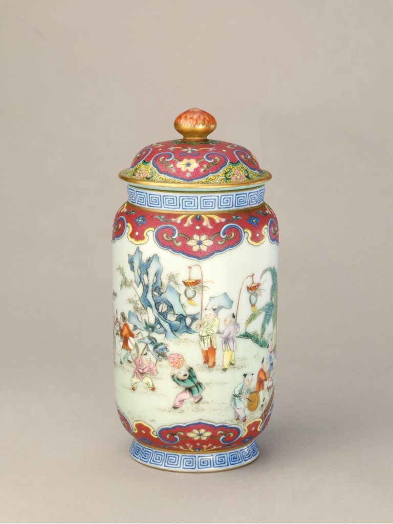 粉彩婴戏图壮罐,清乾隆,高14.9厘米,口径5.8厘米,足径5.5厘米。