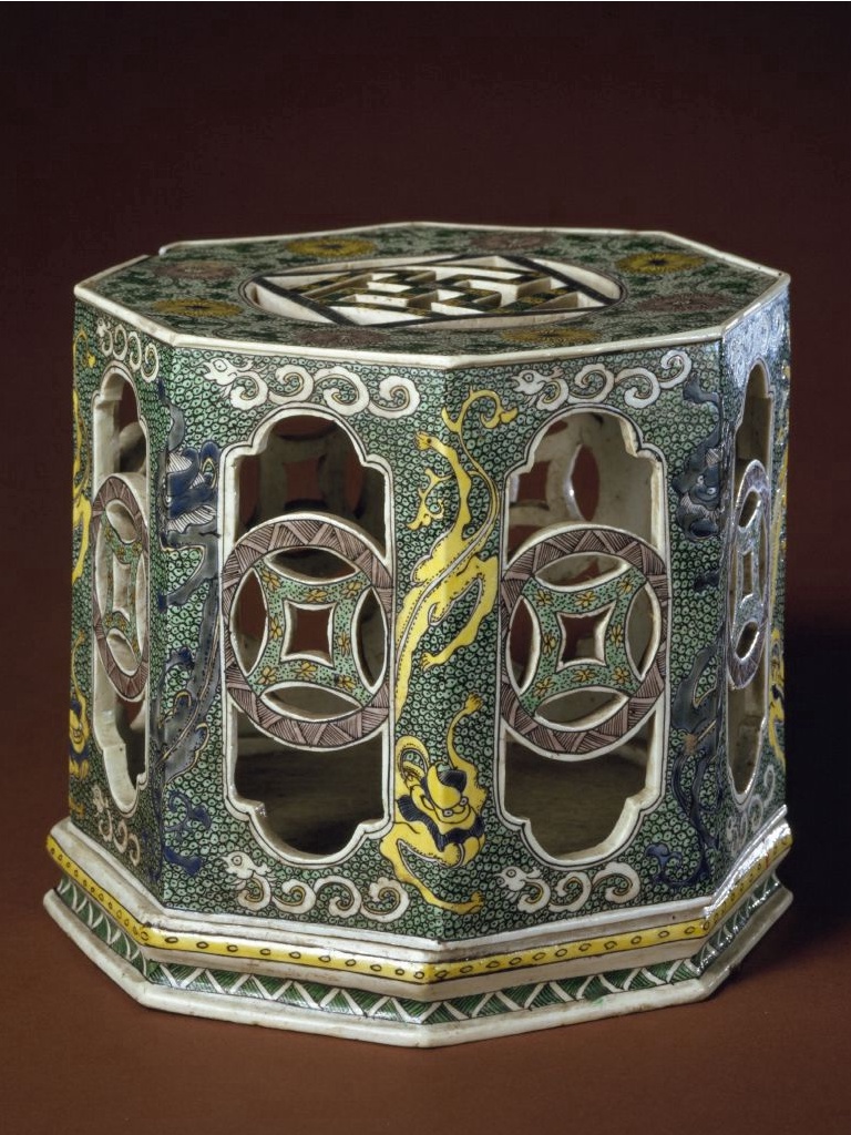 素三彩镂空熏,清康熙,高17厘米,面径20厘米,面边长7.8厘米,底径20.3厘米,底边长7.8厘米。