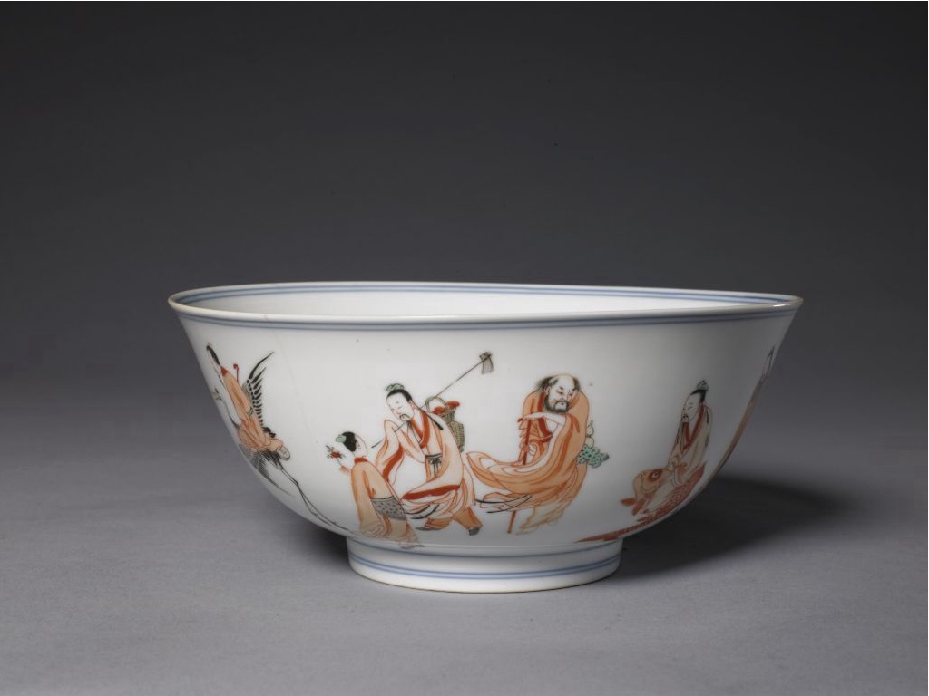 矾红彩人物纹碗,清康熙,高8厘米,口径18.7厘米,足径8厘米。