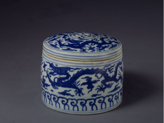 青花云龙纹蟋蟀罐,明隆庆,通高10.6厘米,口径13.2厘米,足径13.4厘米。