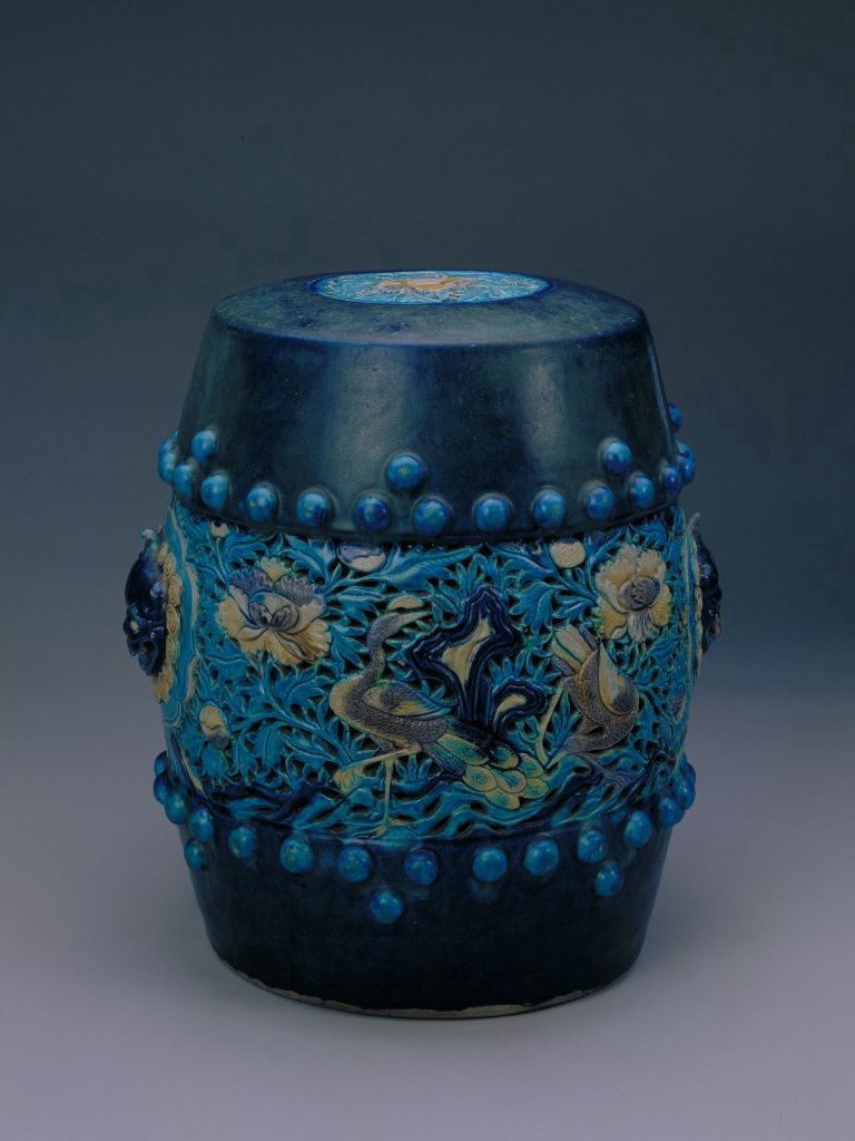绣墩呈鼓式,中空,面微鼓。墩面中心镂刻牡丹纹。腹上下各饰凸起鼓钉纹,腹中部镂雕有凤来仪图,朵朵牡丹竞相怒放,枝叶纵横交错,洞石交叠,山影重重,祥凤翩翩起舞。腹两侧各贴塑一兽面耳。通体所施釉色为白、蓝、紫及孔雀蓝四种。