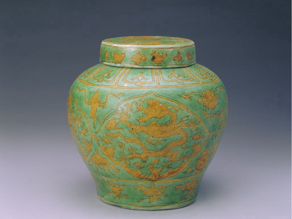 罐直口,短颈,丰肩,鼓腹,圈足。罐外壁绿地黄彩装饰,肩部饰变形莲瓣纹,腹部4个菱形开光内均饰云龙纹,开光上下分别以法轮、法螺、宝伞、白盖、莲花、宝罐、金鱼、盘肠等八吉祥相隔。盖面中心饰云龙纹,外部环绕11个变形莲瓣纹。圈足内施白釉。外底署青花楷体“大明万历年制”双行六字款,外围青花双线圈。