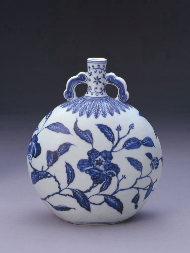 花卉题材在明代宣德瓷器装饰中占据主导地位,其中石榴花、菊花、莲花、茶花、牡丹、百合、宝相花、牵牛花等较为常见。每种器物多由2种、4种、6种或更多种类花卉通过不同形式组合在一起,形成变化丰富的花纹装饰。除花卉组合使用,也流行以单独花卉为饰,此件扁壶即为一例。其腹部两面各绘茶花一枝,笔触细腻,图案写实,别有一番情趣