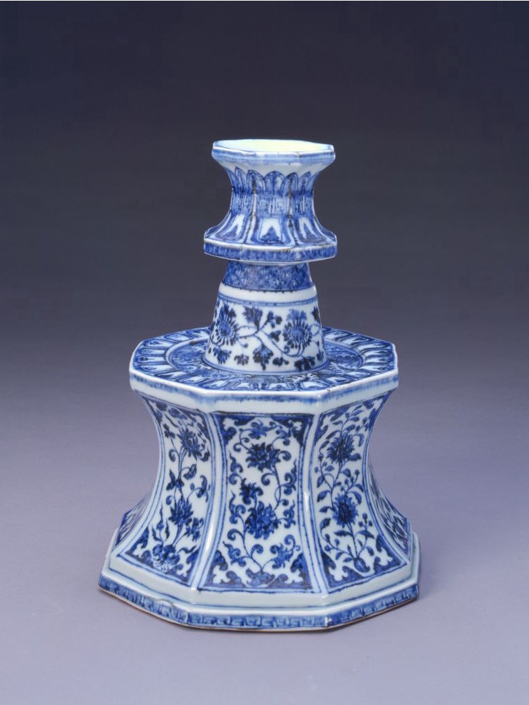 此八角烛台仿自阿拉伯铜器,结构复杂,装饰华美。绘制纹样使用的青料为进口钴料,即所谓的“苏泥勃青”,青花色泽浓艳,有晕散感。