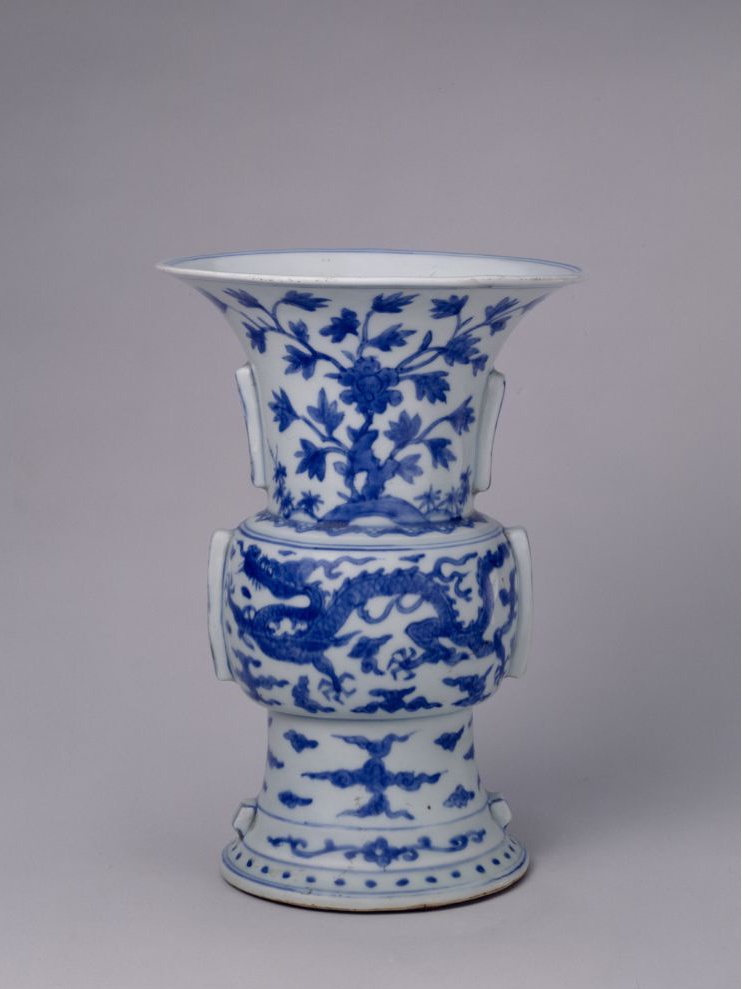 青花龙凤纹出戟花觚,明万历,高21.9厘米,口径15.7厘米,足径11.3厘米。