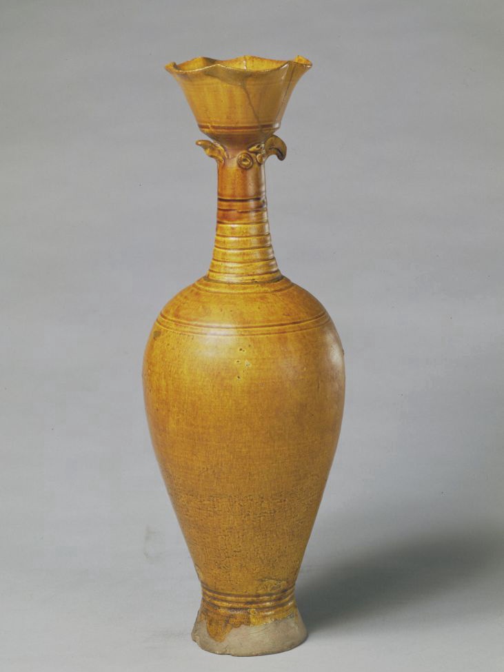 瓶花口外撇,细长颈,溜肩,长腹,束胫(音jìng),圈足。颈部贴塑一凤头,前有嘴、后有冠,两侧各塑出凤鸟眼、眉、耳。颈部装饰弦纹多道。通体施黄釉,釉内隐现深色的条状与点状斑纹。
