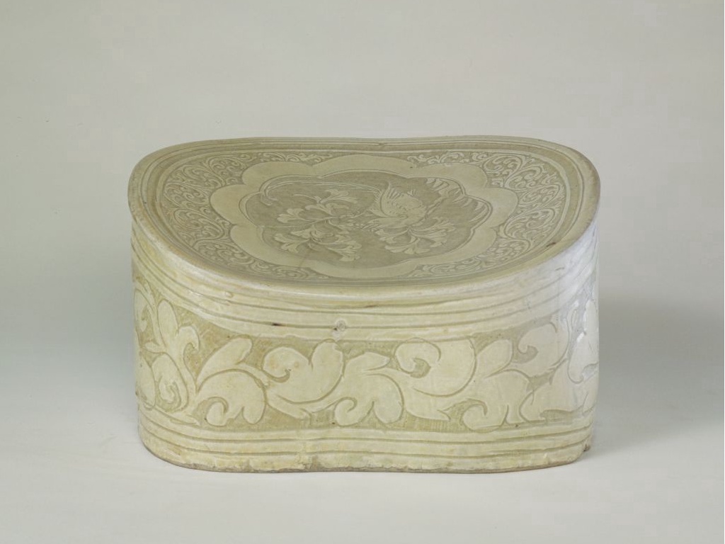 枕呈腰圆形,微出沿,枕面前低后高。胎体施化妆土。枕面中心花形开光内剔刻一株折枝花卉纹,枝头上的绶带鸟正在振翅鸣叫。开光外饰卷草纹。枕侧上下随形划弦纹,弦纹之间剔刻缠枝花叶纹。枕身施透明釉,底不施釉,有两个圆形通气孔。