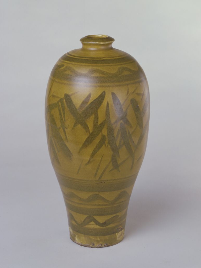 此瓶之黑彩覆于褐黄釉下,呈现出与磁州窑白地黑彩器不同的艺术效果。梅瓶在宋、金、元时期的北方磁州窑、山西介休窑等地许多窑口均有烧造,但此种在褐黄釉下绘黑彩竹纹的梅瓶并不多见。此瓶应为盛酒用具。