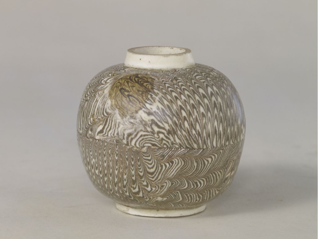 罐小口,丰肩,鼓腹,平底。口、底部施白釉,罐身以褐、白两色泥料揉绞出有如羽毛样花纹,新颖奇特。