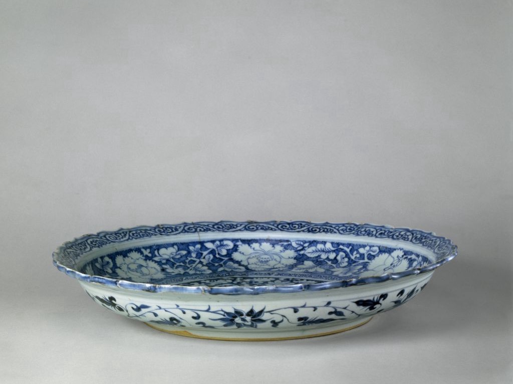 盘折沿,菱花式口,盘心坦平,圈足。通体施青白釉,底素胎无釉。盘内外绘青花纹饰多层。折沿上绘卷草纹,内壁青花网纹地上突出白色缠枝牡丹纹,盘心边缘环以卷草纹,中央青花地烘托麒麟、翔凤各一,空间衬以白色的莲花及朵云纹。盘外壁绘缠枝莲纹。