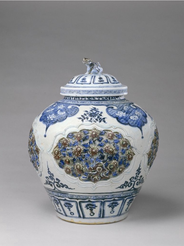 此罐1965年出土于河北省保定市元代窖藏。造型丰满浑厚,纹饰层次鲜明,综合了绘、镂、塑、贴等多种技法,特别是镂花装饰在元代瓷器上较少见。青花、釉里红在作品中互为衬托,红、蓝交相辉映,整体形成一种气度雍容而又花团锦簇的艺术效果。