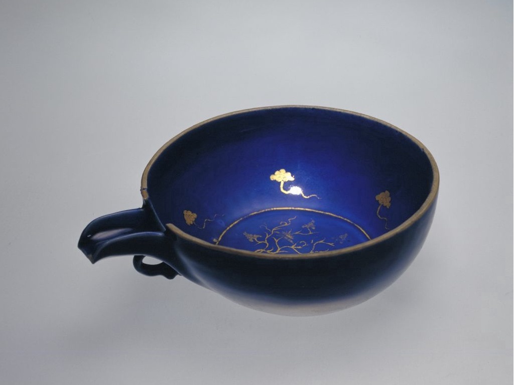 该器造型模仿青铜匜,蓝釉闪烁着宝石蓝般的光泽,配以熠熠生辉的金彩,光彩夺目。这件蓝釉描金匜1964年出土于河北保定窖藏,同时出土的还有蓝釉描金小杯和盘。