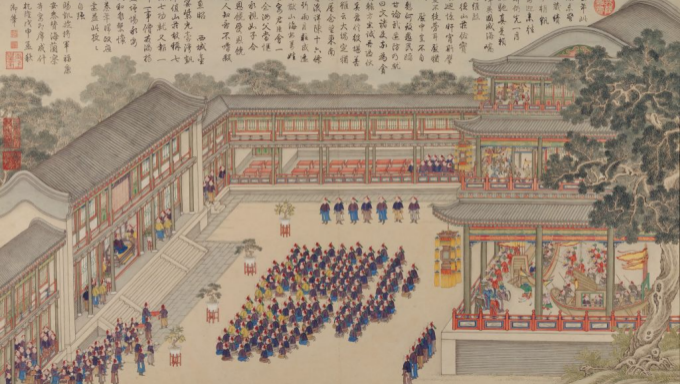 清宫廷画家绘,描绘平定台湾林爽文起义后乾隆皇帝在承德避暑山庄福寿园犒劳凯旋将士的场面。图中真实地描绘了当时园内清音阁戏楼盛大的戏曲演出活动。清音阁戏楼与宫中宁寿宫畅音阁戏楼规模一致,从目前仅存的此幅大戏楼演剧的形象资料,可了解当时宫廷在此类大型剧场看戏的情况。清代帝后常赐王公大臣等一起听戏,听戏之所在大戏台两侧的东西廊内。每间廊下设小炕桌前后两排,每排各二,地上铺设棕毯,为王公大臣盘坐之处。听戏期间,帝后还赏赐由懋勤殿所备的果品饮食以及如意、荷包、瓷瓶等物品。