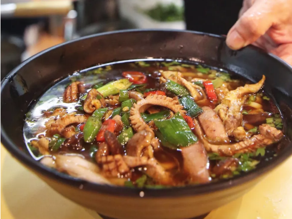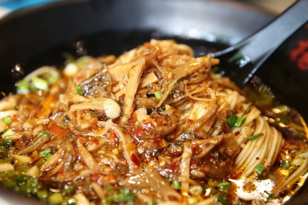 除了鸡蛋碱面,连肉丝、酱汁、杂酱、牛肉和酸辣这五大油码都被列入长沙市级的非物质文化遗产。酸辣面个人比较喜欢,用的是湖南的酸菜和干笋,酸酸辣辣越吃越开胃了。