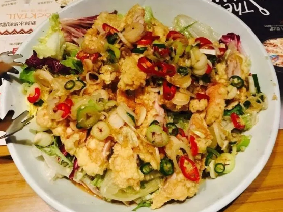 炸鸡里放上蔬菜,大概是对想要减肥的吃货最大的爱。沙拉的酱料很足,搅拌均匀后就不用蘸酱了,里面的炸鸡块外皮也没有那么酥脆,更软嫩一些,吃起来一如既往的甜辣可口。