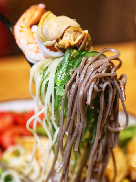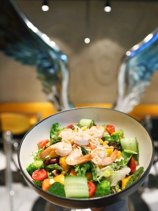 海鲜沙拉鲜虾、海虹、鲜鱿鱼、北极贝,用料炒鸡丰富。