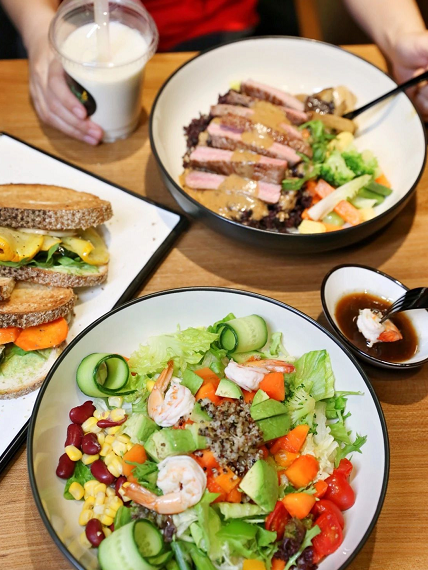 除了常规的沙拉,店里还增加了不少低卡饭、面和三明治,这家店的宗旨,就是均衡的吃蔬菜粗粮和肉、少油少盐的健康饮食,而不是靠节食减肥。