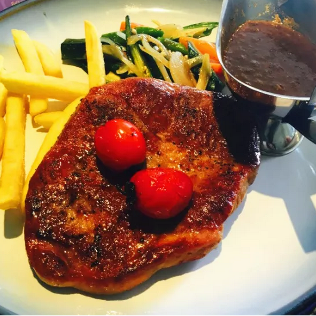 西冷牛排,刚刚煎制好的牛排,淋上恰到好处黑胡椒酱汁,再配上薯条、时蔬...既解腻又美味。