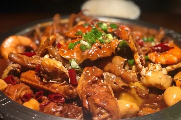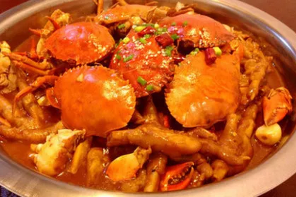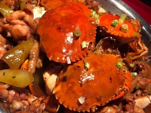 招牌菜,蛮横肉蟹煲。一大锅里面大概有6只大螃蟹,每一只都有手心大小,虽然现在不是应季的螃蟹季节,但是吃起来每只螃蟹的蟹膏都是金黄肥厚的,炖锅焖上那么久之后更加入味,就连蟹壳,都香的不行。配菜中除了常规的几个外,还可以自己选择添加,比如像鱼豆腐或者青笋这样的。