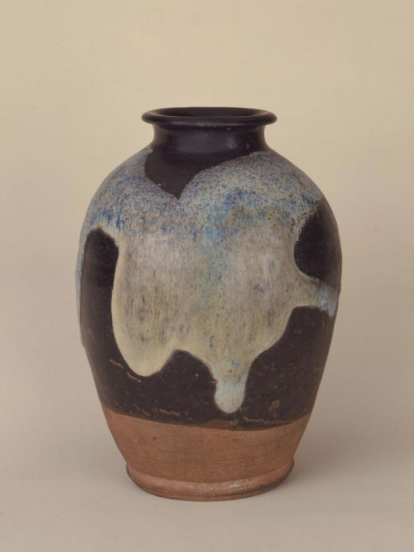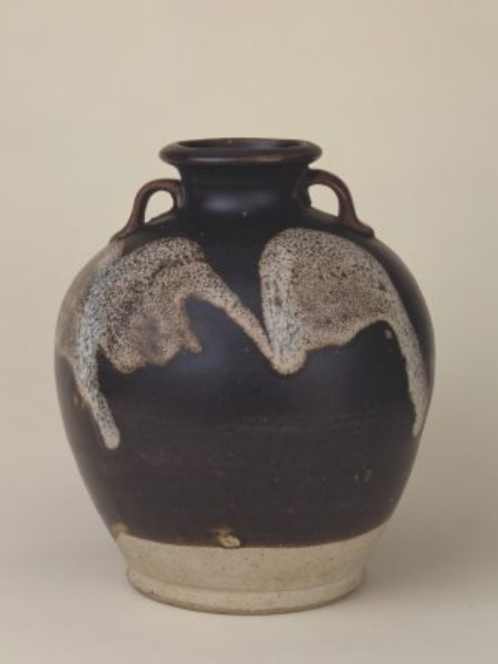 罐口微外撇,短颈,颈两侧对称各置一系,丰肩,肩以下渐收,平底。近底处刻深弦纹一道。通体施黑釉,近底处露胎。乌黑的釉面上装饰四块灰蓝色斑块,似色料自然流淌而成,妙趣天成。