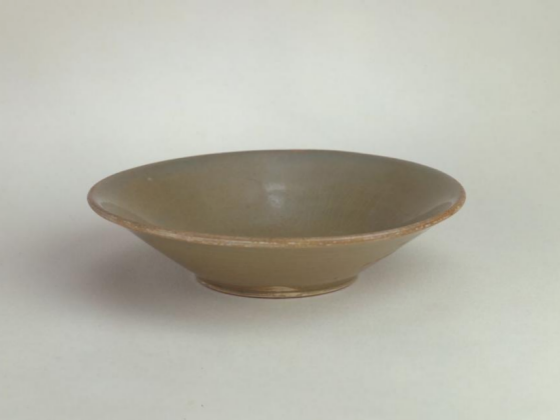 青釉玉璧形底碗,唐,高3.5厘米,口径14.4厘米,足径6.6厘米。