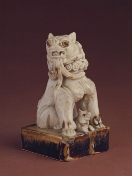 唐代瓷器品种与造型新颖多样。此件白釉子母狮姿态雄健,浑厚古朴,为唐代瓷塑艺术的一件杰作。