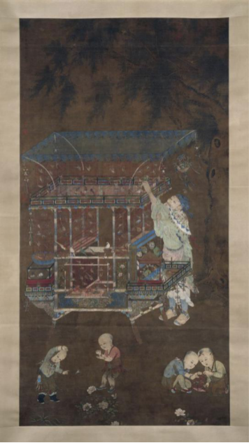 “货郎图”属于风俗画,这一题材自宋代以来就十分流行。画面中货郎衣着整洁,儿童服饰华丽,货架上的各类物品丰富而精致。画法上刻画细腻,设色浓艳,已将宋人民间货郎图中的生活气息转化为宫廷贵族气息,因而又有“宫廷货郎”之称。