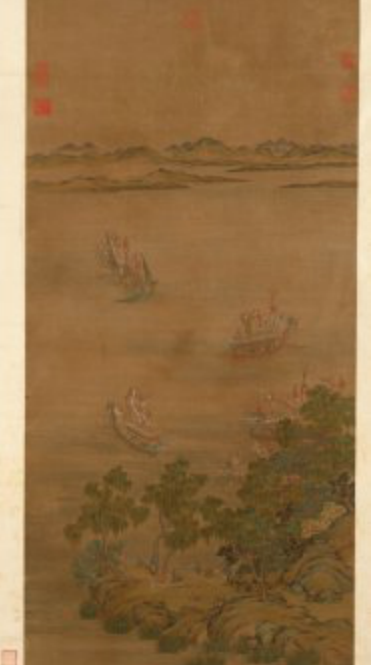 此图描绘的情景正是端午时节,中国南方地区的湖区景象。画面采用马远一角式构图,观看赛龙舟的老少人等集中在画面右下角的岸边,掩映于湖光树石之间,亦有人骑于树干枝头,以便获取更好的观赛角度。而画面大量的留白则形成了烟波浩渺的湖面,湖上四只龙舟、一只凤舟正在挥桨竞渡。远山若隐若现。整幅画面精致工丽而不失活泼,为风俗画的佳作。