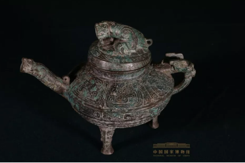 虎蓥”器形作侈口,方唇,短束颈,宽折肩,收腹,圜底,三蹄形足。肩的一侧有管状流,以伏虎为造型,另一侧有龙首鋬,盖折沿,上有圆雕踞虎形装饰,盖与鋬上各有小环钮。“虎蓥”肩部饰卷曲夔纹,腹上部饰横S形斜角云纹,腹下部饰瓦纹,足根饰饕餮纹。在灯光的照耀下,青铜“虎蓥”更显精美。“虎蓥”这一世称的主要依据是流管上的卧虎造型,流管乃商周青铜盉标志性的关键部位,凭此位置上的纹饰对其定名。