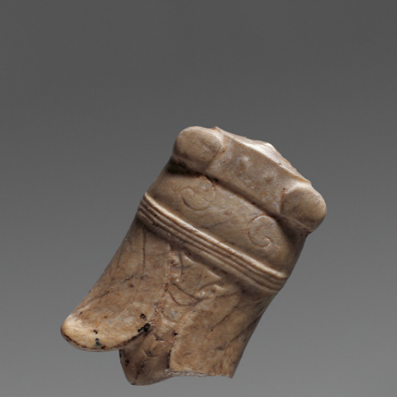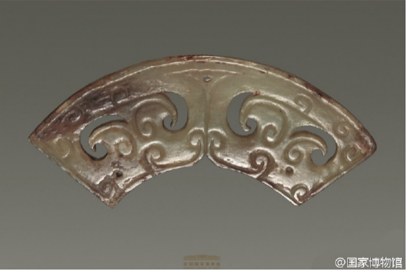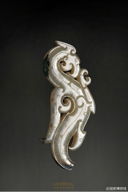 “凤飞九千仞,五章备彩珍。”凤是传说中的神鸟,尊为“百鸟之王”。这件凤鸟形佩出土于河南辉县,双面透雕,鸟头顶有冠,长尖喙向内勾卷,前爪呈抓握状,与喙相连,后爪呈钩曲状,偏向尾部。背部雕有抽象化的翅膀,翅分为两叉,外长内短,均向上呈卷曲状。