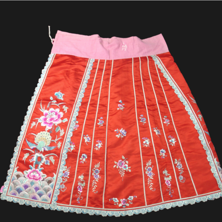 朱红平绣孔雀纹马面裙为清代时期的纺织(绣)品,裙长96厘米,下摆103厘米。红色绸面料,镶滚花绦边,马面处以象征富贵的牡丹和寓意吉祥、幸福、美丽、善良的孔雀为主体纹饰,裙身则绣制吉祥花卉纹饰。