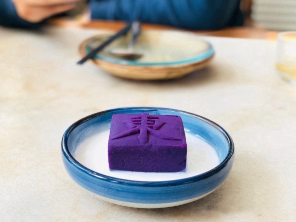非常有意思的一道凉菜。用模具将紫薯泥制作成“东”字样的一小块,再在周边搭配类似乳酸菌的酸奶,很有创意。紫薯泥入口感觉绵绵的,酸甜酸甜的味道很适合餐前开胃。
