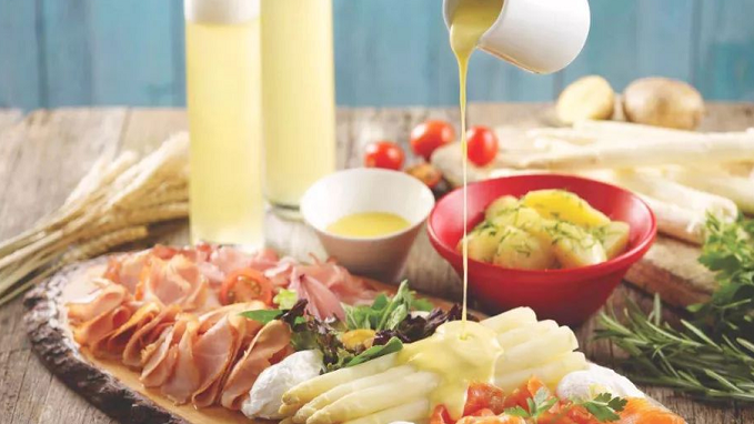 优选400g白芦笋,搭配黑森林火腿、蜂蜜火腿、烟熏三文鱼、水波蛋,美味要与家人朋友共享。
