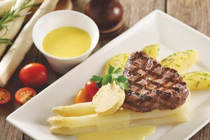 香扒精选牛柳搭配白芦笋,佐以欧芹焗土豆,香草黄油,以及私房荷兰汁。一口白芦笋的香甜,一口嫩牛柳的鲜香,可谓是蔬菜界和肉食界的营养双冠王。