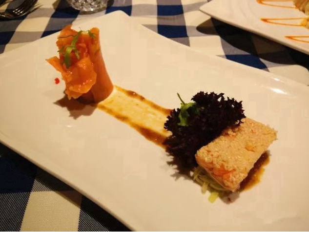 挪威鲑鱼沙拉,一份挪威鲑鱼沙拉你可以吃到两种截然不同的三文鱼肉,一种是做成玫瑰花状生食的烟熏三文鱼肉,而另一种是铺满白芝麻制熟了的三文鱼肉。