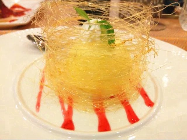 焦糖椰香香草冰淇淋,无论是摆盘还是造型,可以说相当漂亮。焦糖趁热拉丝淋成小罩,把冰淇淋球保护在里面,让人无法抗拒。