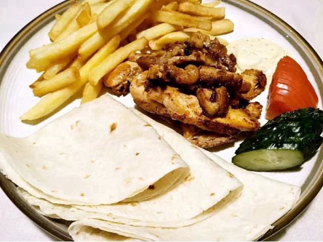 鸡肉卷饼,作为店内推荐菜的第一名,现烤的鸡肉搭配上薯条、黄瓜片和小番茄,卷入刷好酱料的饼中,无论是口感还是味道都是超赞。