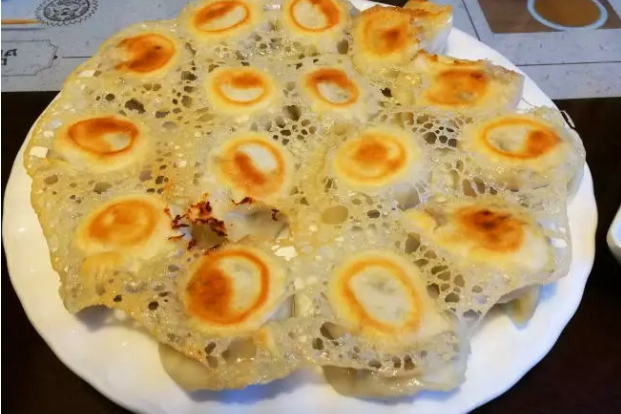 冰花煎饺里面是丰富的蔬菜馅料,不仅样子漂亮,味道也十分清爽。