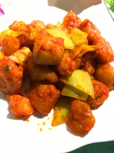 菠萝咕咾肉,用茄子代替肉,使用不同的食材,在口感上有了肥瘦之分,做的非常用心。