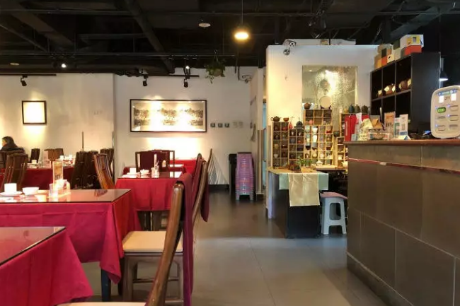 餐厅的整体布局采用黑白绿三色搭配,随处可见书、茶、字、画,很有文化气息,营造出的用餐氛围素雅又能让人放松。