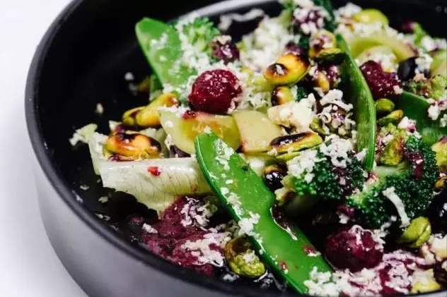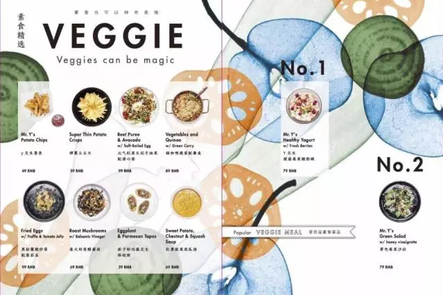 这次来自日本的设计师还跟随了健康餐的潮流趋势,在菜单中单独设置了“素食精选”一栏,将全餐厅的素食菜品单独罗列。清新的背景配色,是不是让你有了“自己吃的超级减肥”的心理暗示?