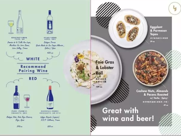同时菜单还有很多有趣的设计和附加信息。餐酒搭配有些迷茫?没关系!三里屯Restaurant y的全新菜单会不失时机地将适合的酒品放在经典菜品周边,保准让你做出最正宗的餐酒搭配~