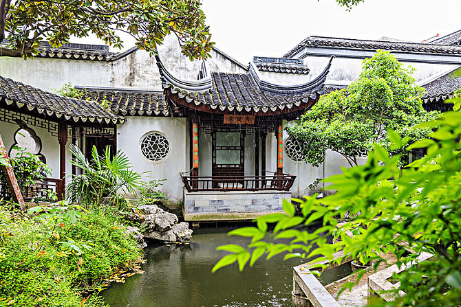 畅园面积约 1 亩余。平面布局是中央凿池,周边环以建筑,是苏州中小园林常用手法,空间配置紧凑,景物层次丰富,在同类园林中具有代表性。从园门入桂花厅,经小院至桐华书屋,全园即展现目前。水池面积占全园四分之一,岸缘围以湖石。南端架五折石板桥一座,分池面为二。沿岸疏植白皮松、紫薇、石榴、木樨等花木。顺东墙向北,经六角形延晖成趣亭和方形憩间亭,走廊蜿蜒起伏,傍水依垣,其间并点缀竹石小品,增益情趣。穿越北岸方亭,即至主厅留云山房。厅前平台临池,亦为园中主要观赏点之一。由西廊南行,至船厅涤我尘襟,厅东侧面池,与憩间亭相对。再南即可登西南隅的石假山,山巅有待月亭,是全园最高处。自亭内沿石磴穿石洞下山,或循南端斜廊回桐华书屋。