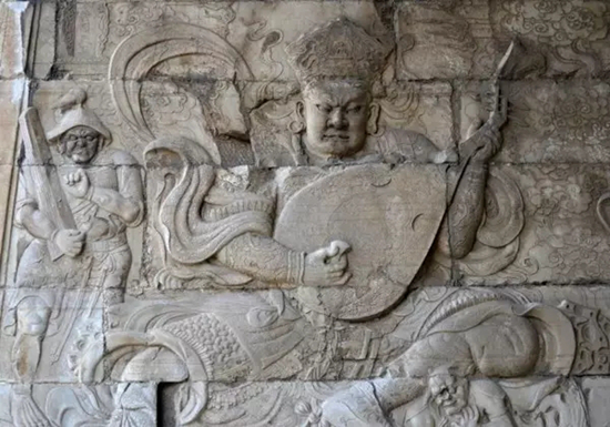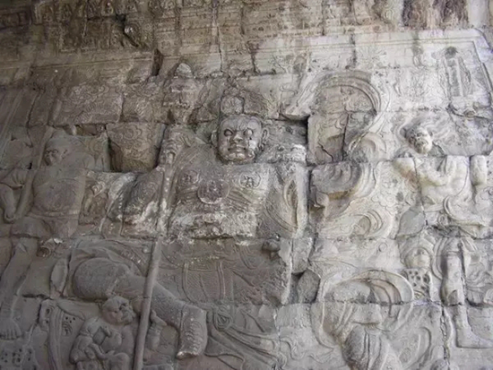 云台券洞内石壁的东西两端,刻有佛教四大天王的坐姿浮雕像,每尊雕像高2.75米、宽3.65米。东方持国天王怀抱琵琶,能护持国土,保护众生;南方增长天王手握宝剑,能令众生增长善根;西方广目天王叉手缠赤龙,能以净天眼观察世界万物;北方多闻天王手执宝伞,以福德之名闻于四方。