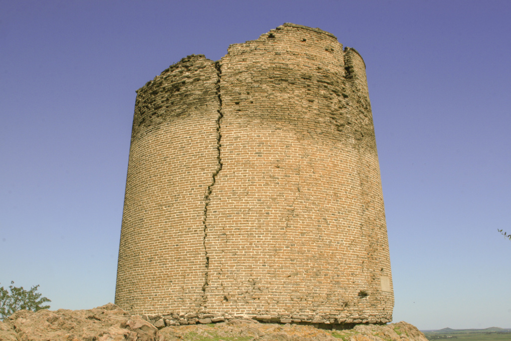 冮台山烽火台平面为圆形,剖面呈梯形,由下至上逐渐收分,台体底部为毛石砌筑(高40厘米~120厘米),上为青砖包砌,白灰勾缝,底径13.2米,顶径10.6米,通高12.9米。现存青砖120行,青砖长38厘米、宽16厘米、厚8厘米。南侧顶部设有1个出入口,高2米,宽1米。