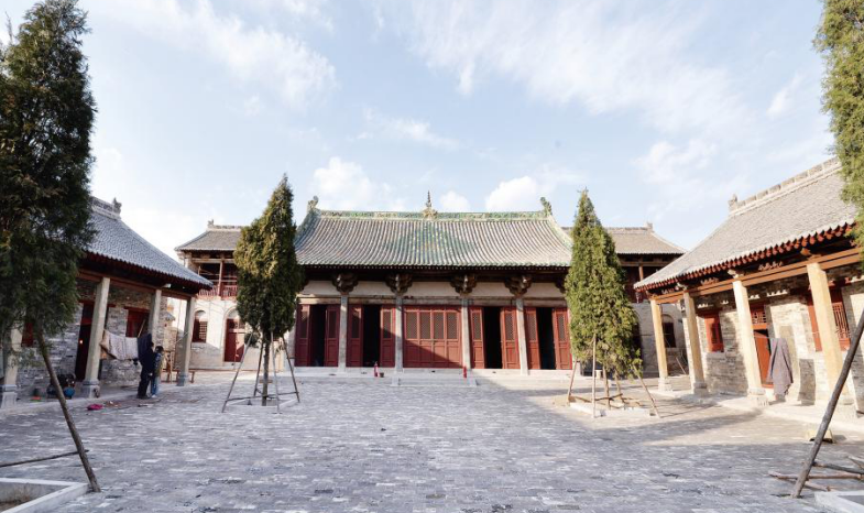 中殿面阔五间,进深六椽,单檐硬山顶,建于高50厘米的台基之上,中设踏跺三级。